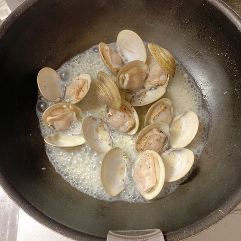 살짝 끓으면 화이트 와인(또는 소주, 요리술)을 붓는다.