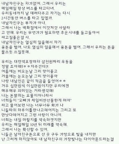 저거 쓴사람 결국 저 남자가 다른 어린여자한테는 명품선물하고 좋은곳에서 밥먹고 하는거 보면서 현타와서 각성한 글 쓴거 있는데 그것도 퍼와야지 ㅋㅋㅋㅋ글쓴분 흑역사로 이불 꽤나 차셨었음