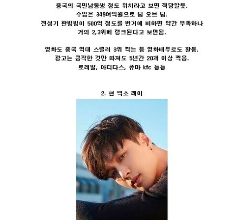 알다시피 아직 한국의 엑소 소속이지만, 실질적으로 활동은 안한지꽤 됐음. 현재 엑소는 8인 체제라고 보면됨.2018년 납부한 세금만 32억원 가량.한국의 1프로 톱스타가 연간 수입이 42억원으로 조사된걸 감안하면수입만 가지고 보면 한국 톱스타들 싸대기 후리고 다니기 가능. 프로듀스101 짝퉁 남자버전에 나가서 대표프로듀서 즉 장근석, 보아, 이승기 역할함. 알다시피 성소, 주결경이 나가서 트레이너 역 맡은그 프로그램임. 제작비도 500억원 넘게 들었다니 한국의 5-10배 가량됨.