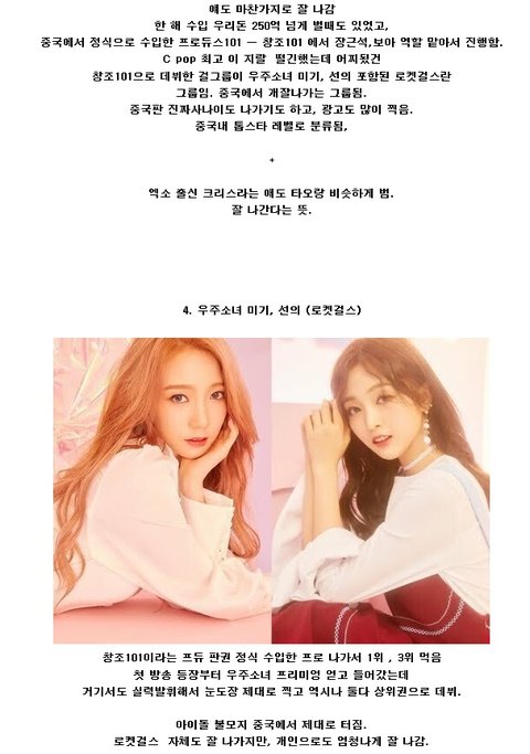 미기 본인 솔로앨범 20분만에 판매량 100만장 돌파함. 광고 측면으로도 이미 톱스타 레벨이 확인되는데한국에서 아이돌들이 찍을수 있는 최고 레벨이 치킨광고, 음료수광고 정도라면 미기는 벤츠광고, 샤넬광고, 핸드폰 광고 등을 섭렵했다. 이 정도면 굳이 수입얘기 안해도 짐작가능하겠지?선의는 미기 정도는 아니지만 광고 많이 찍는중(로레알 등) 우주소녀가 한국에서 빌빌대는것과는 다르게 굉장히 잘 나가는 중.따라서 한국 복귀가능성 굉장히 희박하다. + 성소는 중국에서 나쁘진 않지만 톱스타 급은 아니다.예능 위주로 출연하고 있으며, 음반을 내는 것도 아님.광고는 몇개 찍음. 웹드라마 같은 곳에 출연해서 배우로 활동함.한국에 한다리 걸쳐놓은 상태라 우주소녀 복귀가능성 있음.