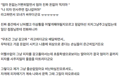 놉. 안쓰러워서 피자주면 아이교육상 절대 나쁩니다. 그 아이는 다음에도 맘대로 주문해도 되는구나를 배울테고 아무리 먹고싶어도 엄마 상의없이 주문하는 행위는 절대 옳지않은 행동입니다.