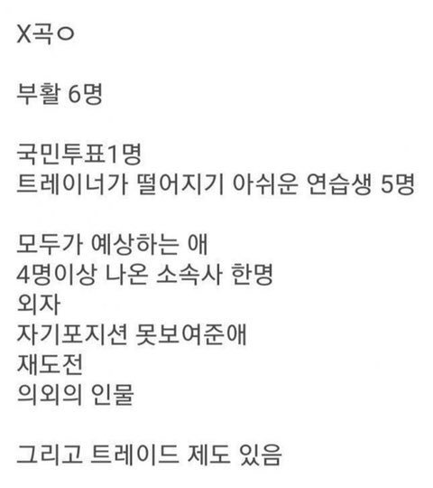 모두가 예상하는 애 - 권태은? 누구야 난 예상안감... 4명이상 나온 소속사 한명 - 문현빈 or 김동윤 외자 - 백진 자기포지션 못보여준애 - 몰라 재도전 - 김동빈 의외의 인물 - 위자월...?