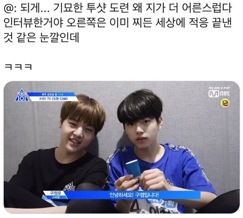 남도현이 더 애기같음... 나 처음 알았어ㅋㅋㅋㅋㅋㅋ 둘이 같이 있는 모습 한 번도 못봤어서 그런지 그냥 도현이가 키도 더 크고 어른스러운 느낌이 강해서 당연히 더 성숙하게 생겼을 거라고 생각했는데 진우 옆에 있으니까 왤케 애기같냐ㅋㅋㅋㅋㅋㅋ 그러면서 왜 자기는 진우보다 더 어른스러운 것 같다고 인터뷰 한 거지???? 둘이 데뷔시켜서 꽁냥거리는 거 보고 싶은 사람이 이 둘 투픽하세ㅕ요ㅠㅠ