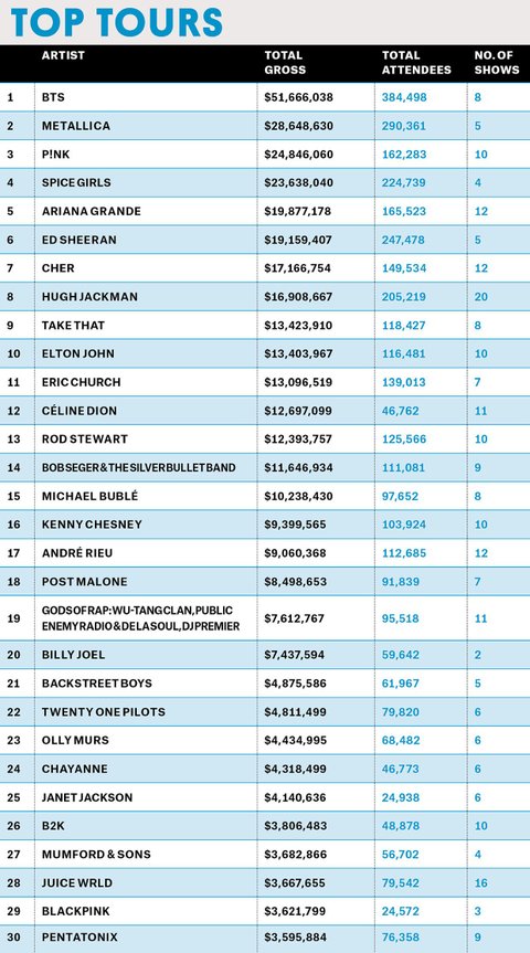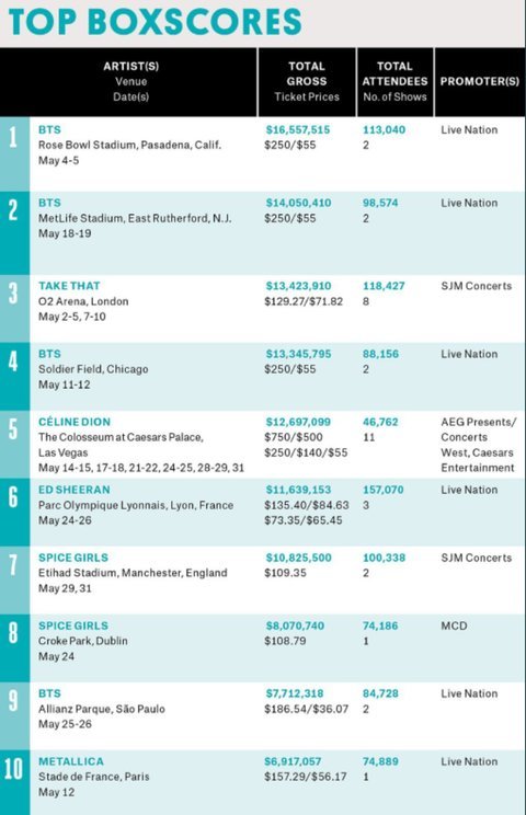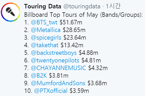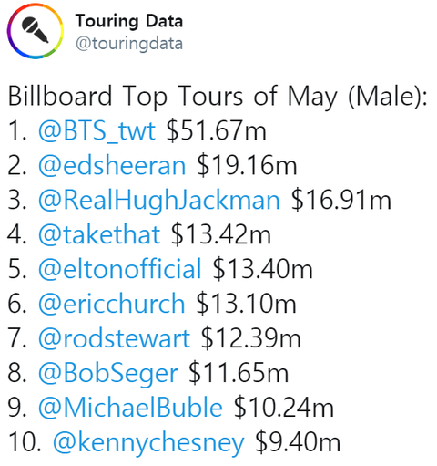 빌보드 5월 탑투어 차트와 탑박스스코어 차트 둘 다 1위.