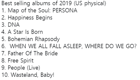 2019년 현재까지 미국 내 실물 앨범 판매량 1위 달성함