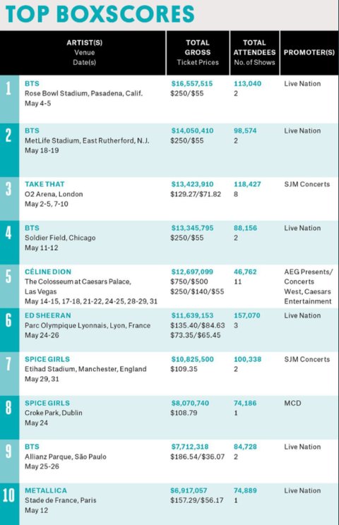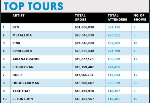이야.. 사실 방탄이 1위겠지~ 당연히 일케 생각하고 있긴했는데(국뽕...ㅋㅋㅋㅋㅋ) 갠적으로 메탈리카 순위가 대박적임. 8,90년대 대표밴드이자, 나도 진심 좋아하는 밴드지만 아직까지 일케 티켓파워 셀 줄이야.. 우리 방탄도 그들처럼 10년 20년 뒤까지 계속해서 콘서트하고 아미들과 더 깊은 유대관계를 가질 수 있길! . !!