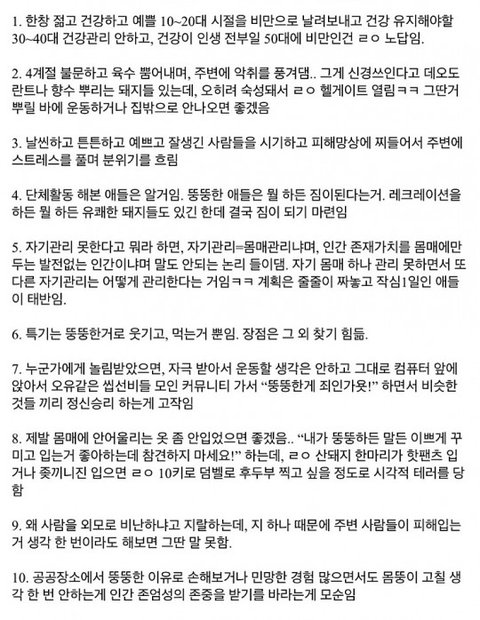 이게 정말 요즘 사람들에 머리 정신상태인건가? 도대체 뚱뚱해서 주변에서 주는 피해가 도대체 뭐지? 내 주변사람들은 아무말도 안하는데 너희 주변에는 도대체 쓰레기만 모여있니? 그렇담 그건 자기자신이 문제겠지만.