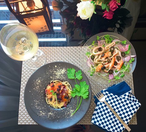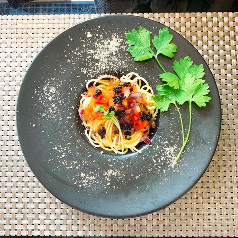 차가운 캐비어 토마토 파스타 & 씨푸드 샐러드
