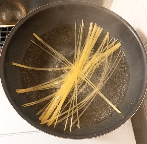 파스타는 1인분의 반만 준비하고 소금물에 정해진 시간 만큼 삶는다.