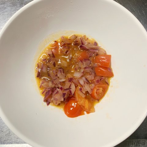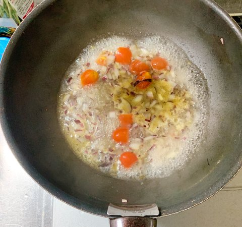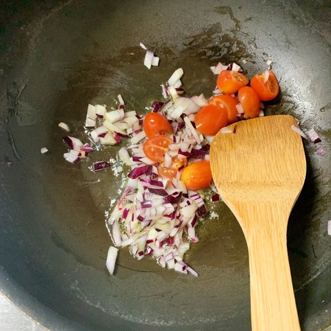 집에 있던 양파(종류 상관없음)와 방울 토마토(일반 토마토)를 올리브 오일에 볶다가