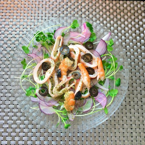 오징어, 남은 새우, 블랙 올리브에 드라이 파세리, 후추로 드레싱 해준다.