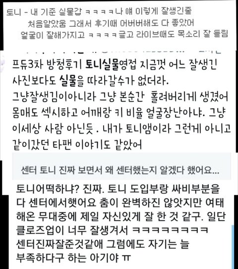 물론 토니픽은 더하면 더했지 ㅠㅠ 다들 이렇게 잘생긴줄 몰랐다고 하고 센터 왜 욕심냈는지 알겠다고 하더라