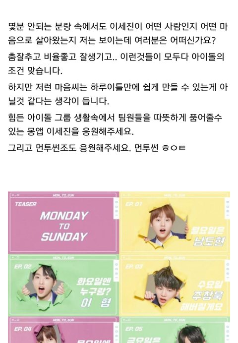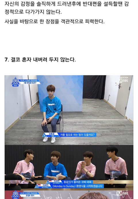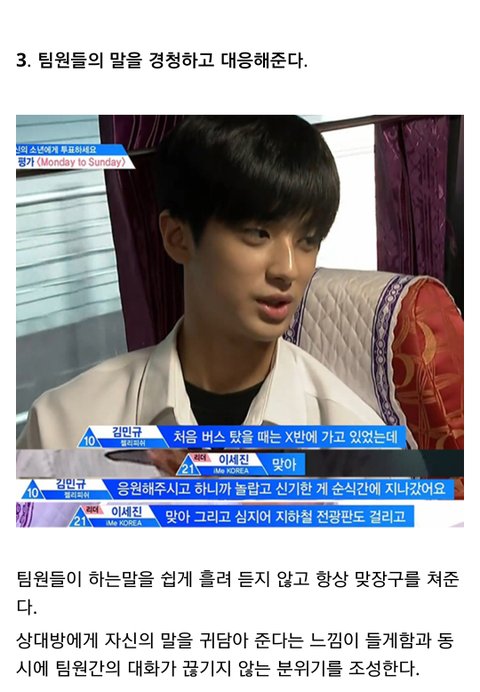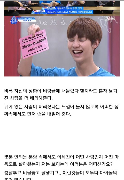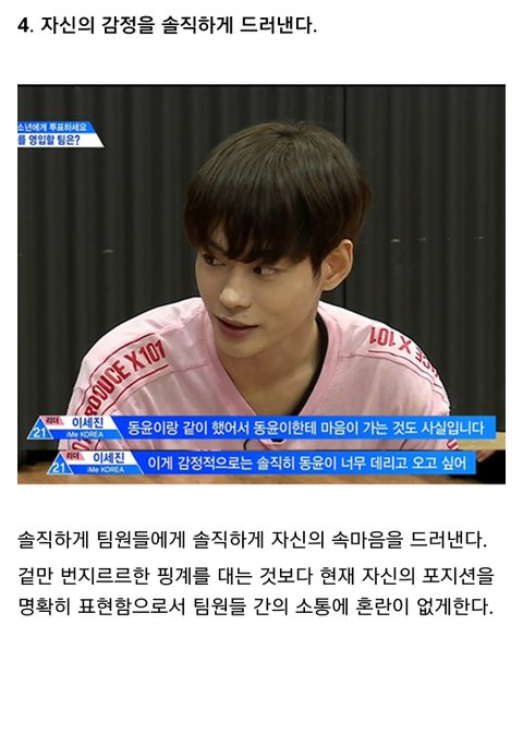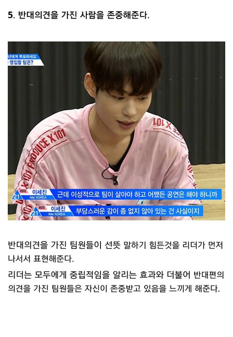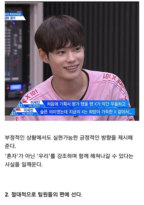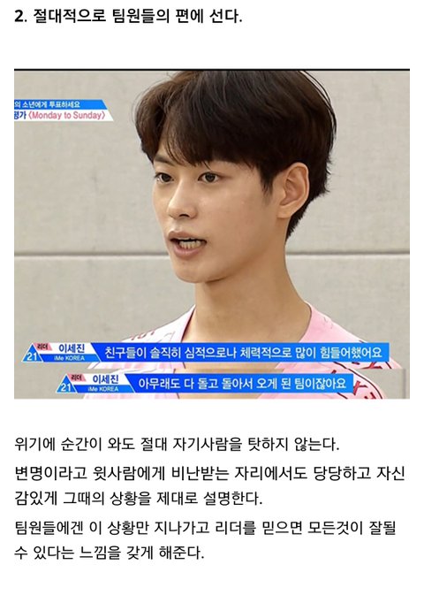 다른곳에서 주운 글 인데 너무 좋은말 같아서 퍼왔어 난 정말 개인적으로 이세진이 리더 맡았으면 좋겠음. 불화없이 오래가는 아이돌 보면 진짜 리더가 중요하다는 생각이 들더라 어떤 사람들은 이세진 실력때문에 리더 하면 안된다고 하지만 지금 3차경연 후기만봐도 춤 많이 늘었고, 심지어 잘 춘다는 말도 있어 24세에 군필이고 리더에 충분히 어울린다고 생각해 실력은 늘면 된다고 생각하는 입장이라 쨋든 긴글 읽어줘서 고마워. 출처는 밑에 남길게. https://m.dcinside.com/board/producex/1872815?recommend=1