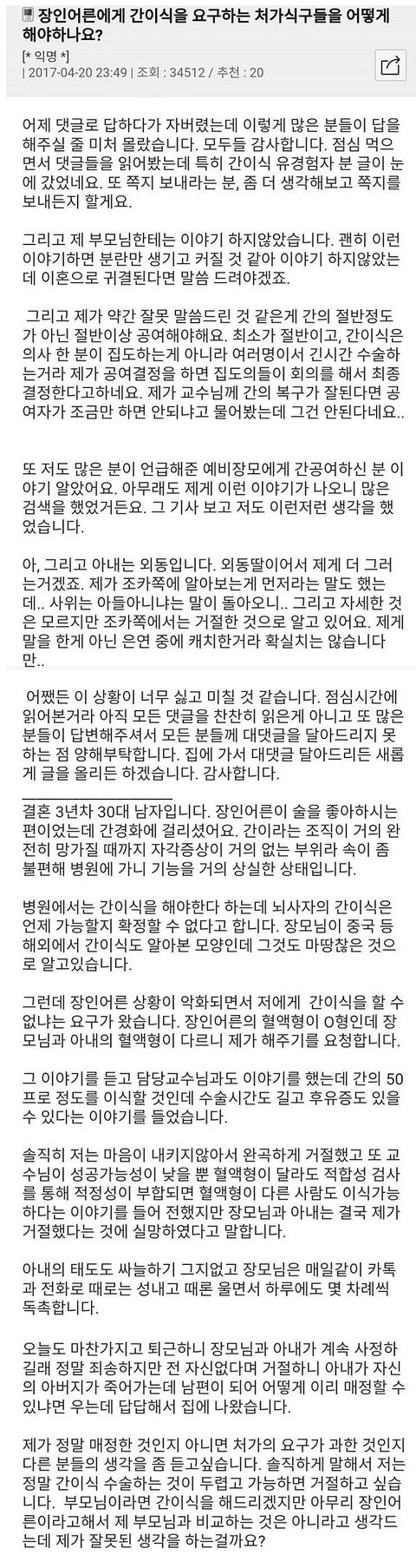 아니, 왜 남의 집 귀한 아들 간을 떼어 달래? 역으로 시어머니한테 내 딸 간 떼어달라 하면 어느 친정엄마가 미쳤다고 그걸 보고 있겠냐고요. 말이 되는 소리를 해야지.