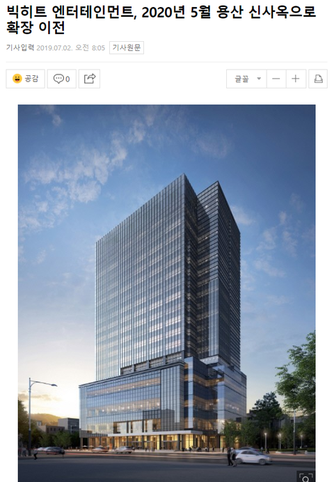 올해 말 완공 예정인 신축 건물(현 건물 명 '용산 트레이드센터')의 지하 7층부터 지상 19층까지 건물 전체를 빅히트 및 관계사가 임대하여 사용할 예정이라고
