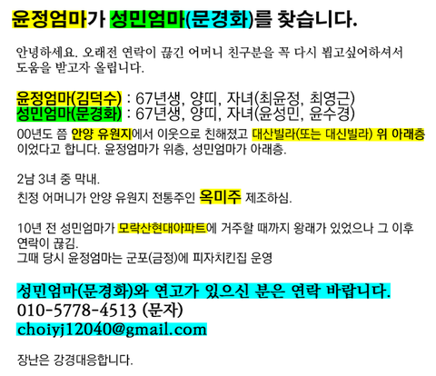 윤정엄마가 성민엄마를 찾습니다 오래전 연락이 끊긴 어머니 친구분을 꼭 다시 간절히 뵙고 싶어 하셔서 도움을 받고자 올립니다. 성함 : 문경화(성민엄마,수경엄마) 67년생 양띠 친정어머니가 옥미주 제조.