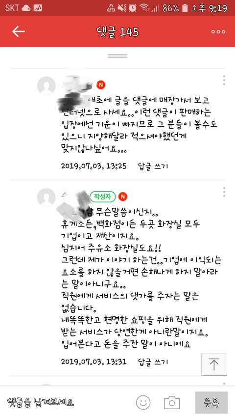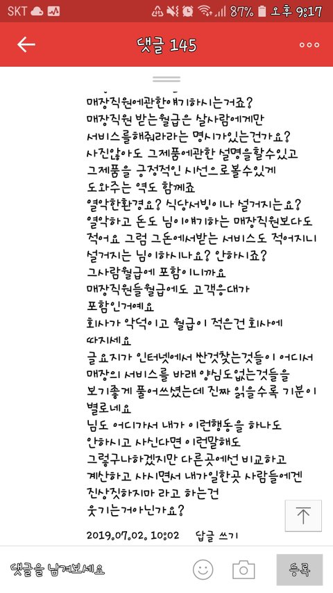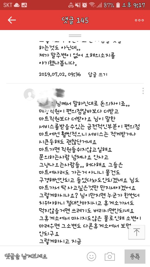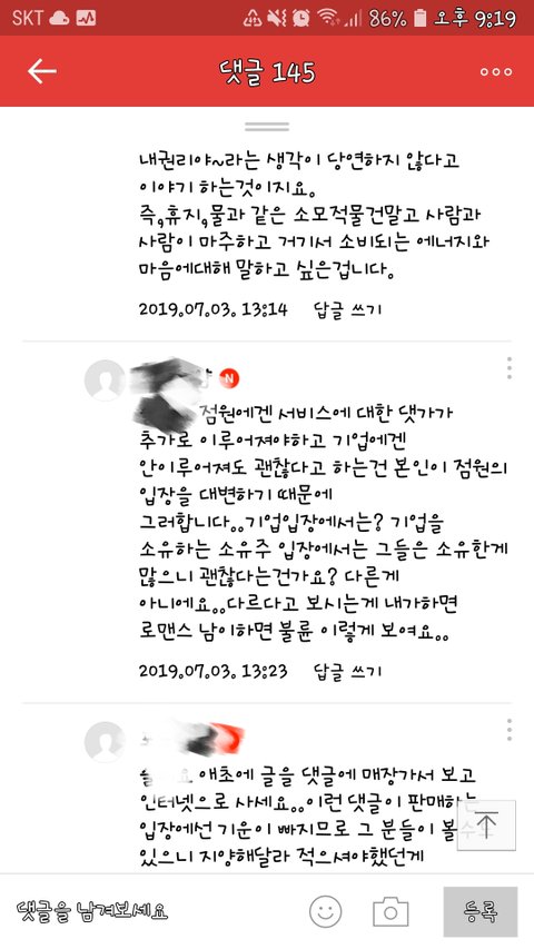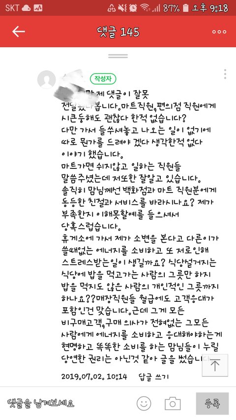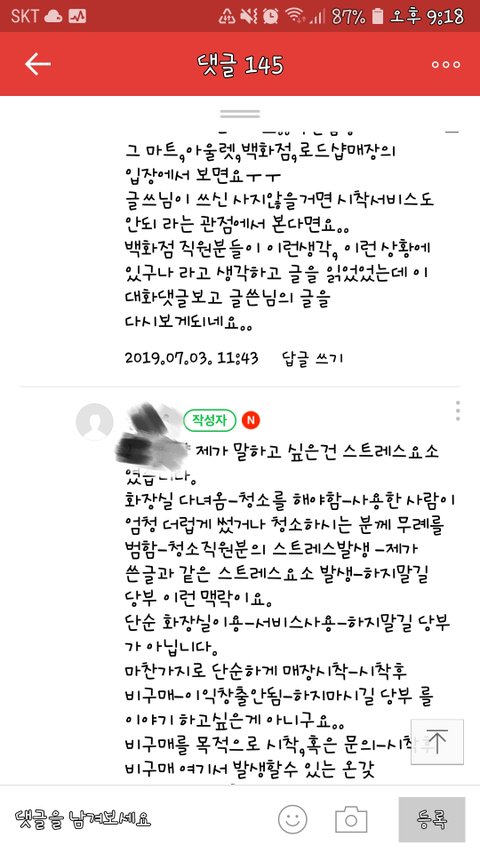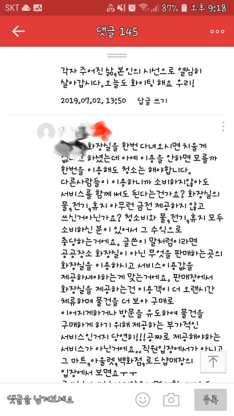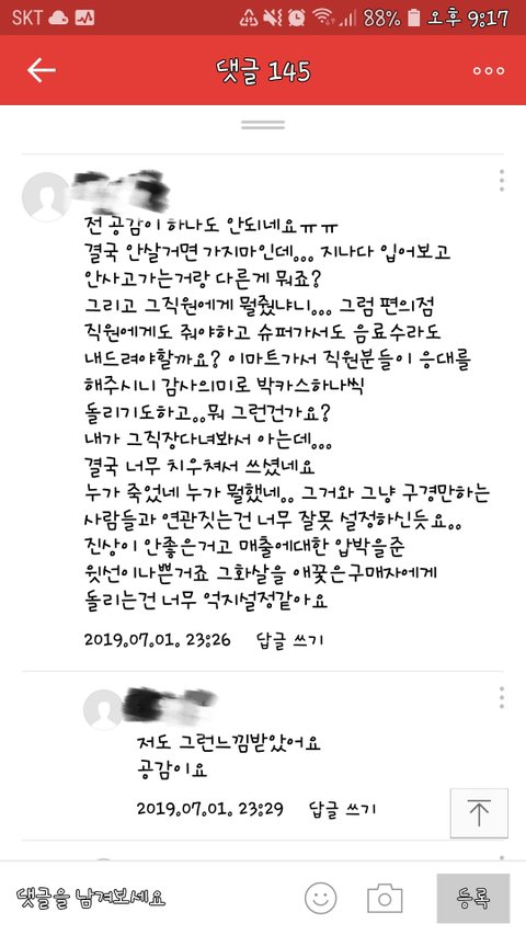 처음엔 동감한다.응원한다 등등 개념찬 엄마들 댓글이 달리더니 점점 권리충들이 모여들어서 소비자의권리네 침해를 했네 별소리를 다함.