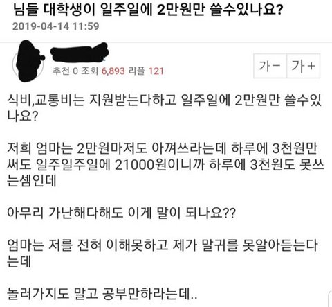 해당 글 작성자는 올해 대학생이 되었으며 집에선 "식비 + 교통비"지원이 답니다.