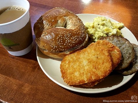 불만인 점은 맨날 비슷한 메뉴라는 거. 베이글과 식빵을 비롯한 빵 몇 종류, 두 세가지 달걀 요리, 아침식사용 소시지와 버거 패티, 해쉬 브라운. 이 정도가 전부입니다.