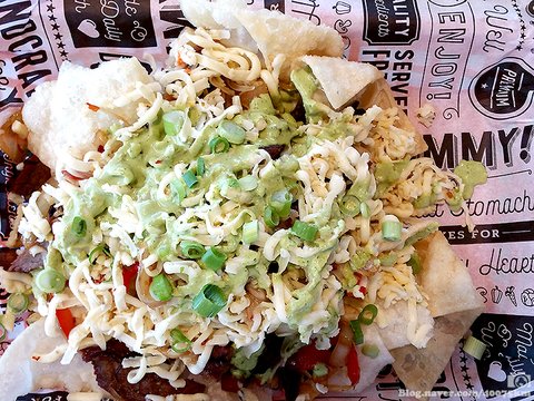이거 꽤 괜찮네요. 갓 튀긴 바삭바삭한 타코 위에 불고기를 듬뿍 얹고, 그 위에 과콰몰리 소스와 치즈를 얹어 불고기의 열로 녹인 다음, 쪽파를 송송 썰어 얹었습니다.