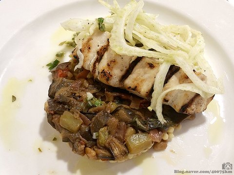 그릴로 구운 참치. 지중해식 버터 소스를 곁들여 나옵니다.