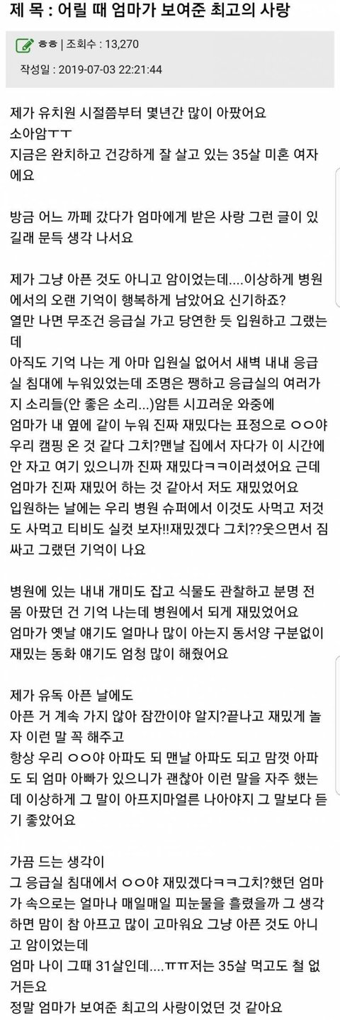 엄마가 참으로 지혜로운 분 이셔요~글읽는 내내 감탄합니다! 심리학 전공인 저도 아이가 소아암인 상황에서 과연 쓰니 엄마처럼 대처할수 있었을까 자문해봤네요....자신 없습니다ㅠ 정말 너무나 현명하고 지혜로운 엄마와 아픔을 잘 이겨낸 쓰니에게 크게 박수 쳐주고 싶어요!
