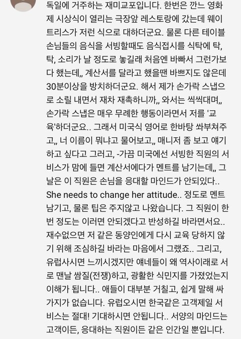 저런 경우는 당연히 따져야하는거아님? 저 영상보면서 개답답했음 나도 당연히 박차고 나오겠지만 나올땐 나오더라도 확실하게 큰소리로 다른 고객들 다 들리게 영어로 간간히 욕도 섞어서 따지고 나올거임 쟤네 영어 못알아듣는척해도 못알아들을리가없음 왜 가만히 조용히 나오는지 이해불가 저러니까 동양인 남자들 소심하다고 무시 당하는거임