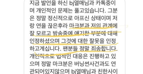 마크는 아프리카 TV가 뭔지 몰랐고, 그 당시 비제이가 직업이 아니셨다고 구체적으로 말씀하신 걸 증명하는 사진이야. 루머 그만 퍼트리고 현실 직시하길 바라.