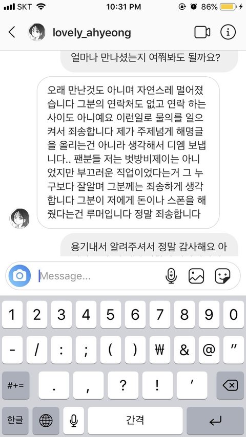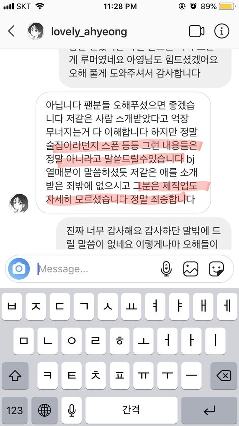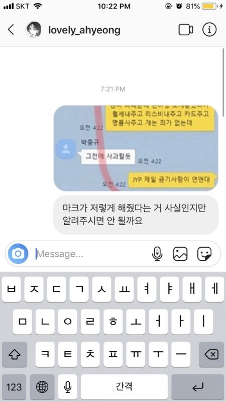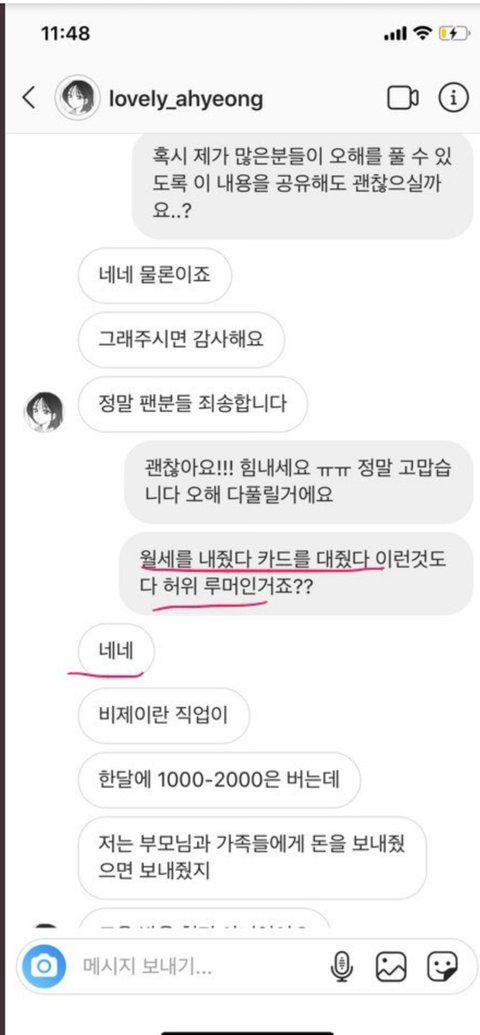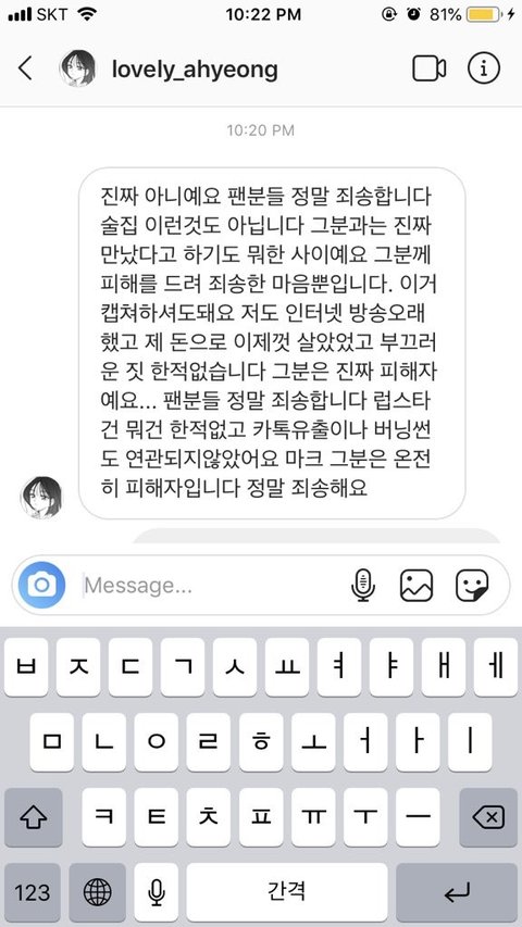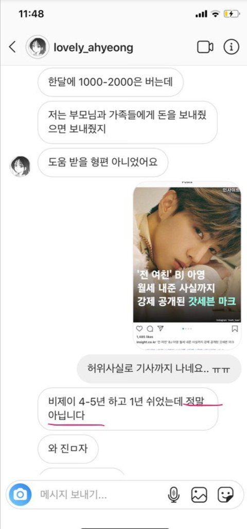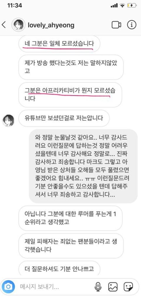 지금 BJ 아영한테 월세부터 시작해서 명품까지 샀다고 갓세븐 마크 난리났던데 그거 아니래!!아가새? 이신지는 모르겠는데 어떤 분이 BJ 아영님한테 DM으로 연락 드렸고 이렇게 답장 왔대