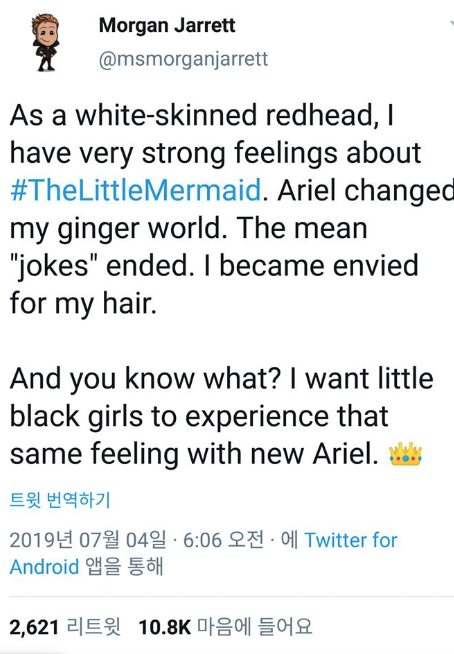 번역) 빨간 머리 백인으로서 난 #인어공주 에 커다란 애정이 있어. 에리얼은 내 진저 세계를 바꿔놨어. 못된 “농담”은 끝났지. 내 머리카락을 부러워했어. 그거 알아? 난 어린 흑인 소녀들이 새로운 에리얼로 똑같은 경험을 하길 원해.