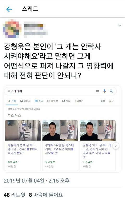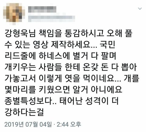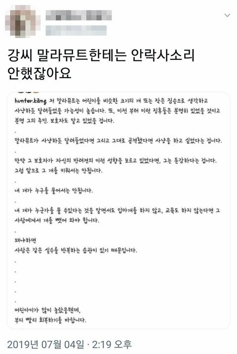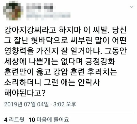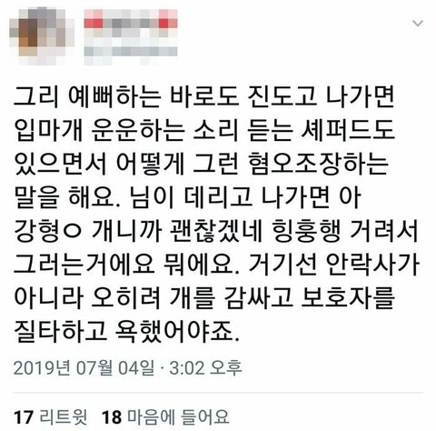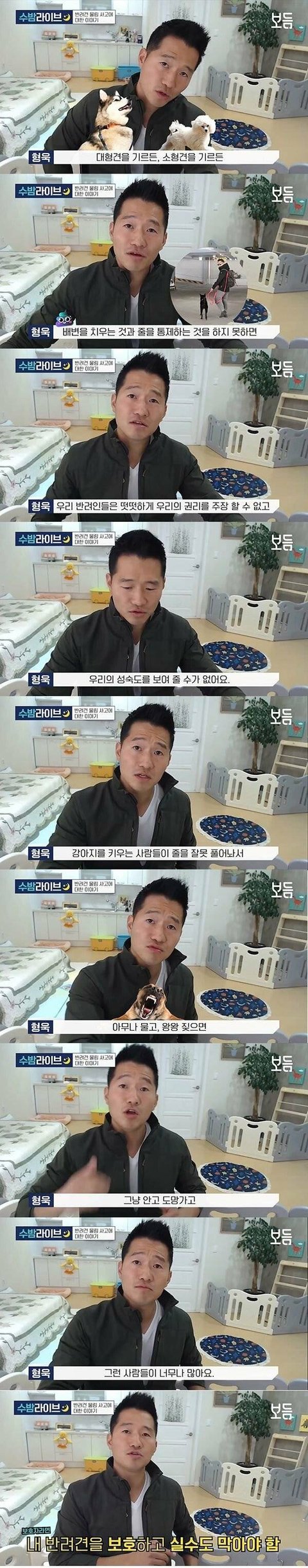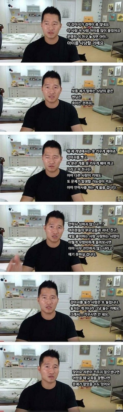 강형욱이 한말이 아니더라도 사람을 공격하는 개는 안락사가 답임.저 개는 이미 동네 아이들 물었음.다리쪽이랑 사타구니쪽.특히 이전에 문 남자아이는 사타구니쪽이라 자칫하면 큰일날뻔함.이미 애들은 자기보다 아래 서열로 보고 공격하는데 이게 고쳐질까? 조련사한테는 안덤비겠지만 아이들한테 안덤비란 법 없고 견주마인드가 갑갑할까봐 입마개 풀어줬다는데 퍽이나...우쭈쭈 우쭈쭈 우리 개는 아이를 좋아해요 이 소리 중인데...내가 다친 애네 부모면 개값 물어주고 복종이 뭔지 참교육 시킨다.