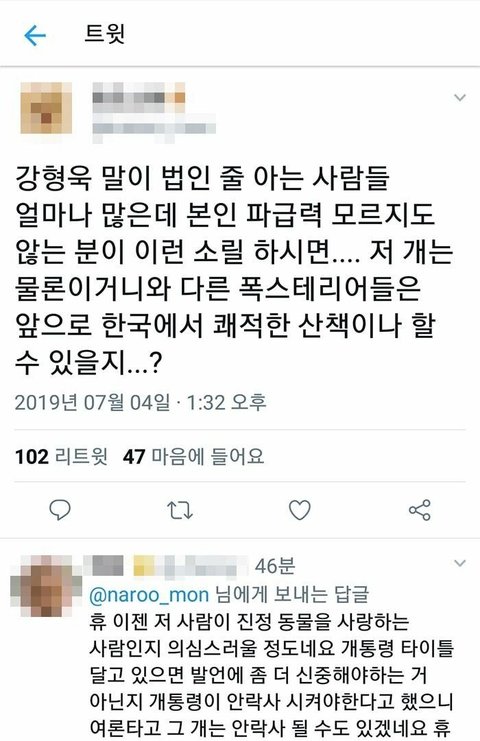 아무리봐도 견주와 그견주가 키우는개에 대한 얘기만 하는데. 견주는 개 키울 자격없고 그 견주가 키운 개는 이미 훈련으로 번복이안된다는걸 얘기하는데 다들 찔리나봐요. 산책나갈때 개를 바짝붙여걷는사람들도 많지만 막 풀어놓는사람도많아요. 전 개 무서워하는데 가까이오면 언제라도 발로찰 준비하며 걸어갑니다. 물린다음엔 나만 손해잖아요.
