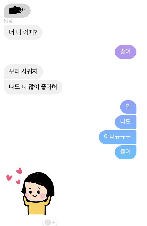 그리고 지난번에 통화하고 끊었는데 갑자기 페메로 자기 어떻게 생각하냐고 묻는거야 그래서 내가 좋다고 하니까 자기도 좋다면서 사귀자 했어 전화로 하려 했는데 부끄러웠다고...ㅎㅎ