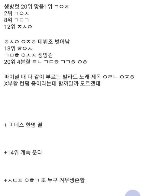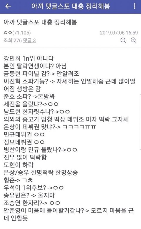 은상이 데뷔권이랬으니까 은상/승우 중 떡락은 승우로 보임(스포 중 거의 대부분이 공통적으로 승우는 데뷔권 벗어났다고 했음)