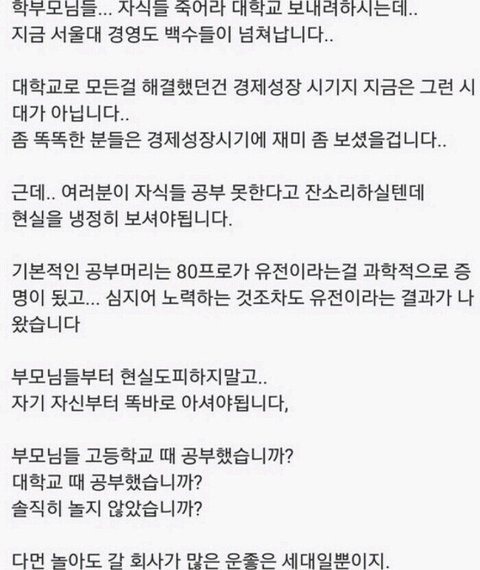 유전보다는 그 가정의 분위기 때문 아닐까? 각자 부모님을 비하하려는게 아니라 예를들어 부모님이 교수라서 어릴때부터 공부환경이 조성된 자녀랑 부모님이 평범한 직업이셔서 보통의 아이들처럼 놀면서 자란자녀는 조금은 다를거잖아