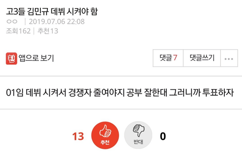 근데 김민규는 데뷔해도 수능이든 수시든 쳐서 대학갈것같음ㅋㅋㅋㅋㅋㅋㅋ 그것도 자기 가고싶은 과에 자기 재량것