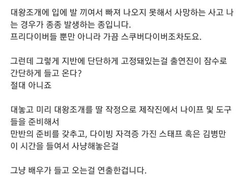 요약 1. 엄청 큰 문제다 2. 프리다이빙으로 딸 수 없음 3. 제작진에서 준비하고 배우가 딴 걸로 연출했을 가능성 높음