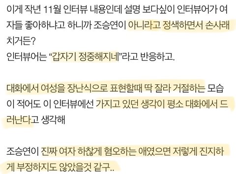 자극적으로 부풀려진걸로 조승연을 판단하지말아줘 걔가 진짜 여혐이었으면 상식적으로 팬들이 이렇게 붙을리가 없잖아