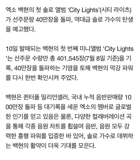 3일만에 솔로 초동 1위 달성했는데 선주문 40만장이라니ㅋㅋㅋㅋㅋㅋ 엑소 백현이 아닌 솔로 백현인데 화력 대박이다 초동 얼마일지 진짜 궁금함