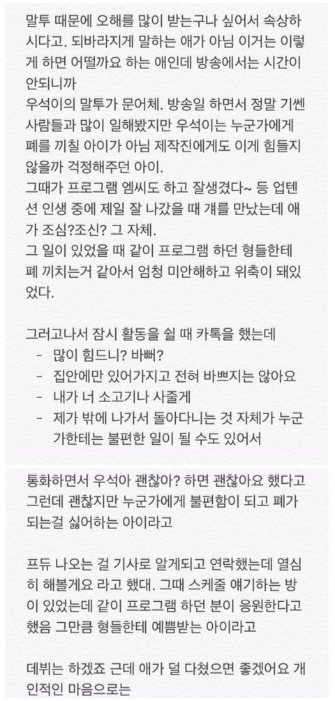 근데 이제 그 때, 우리 같이 방송했던 아이돌 애들, 약간 뭐 스케줄 이런거 이야기 하는 방이 있거든요 ㅇㅇ이도, 우석이 응원한다고. 응 그러니까 그만큼 형들한테 예쁨을 받았던 애에요. 응 좀 그런… 말투로..