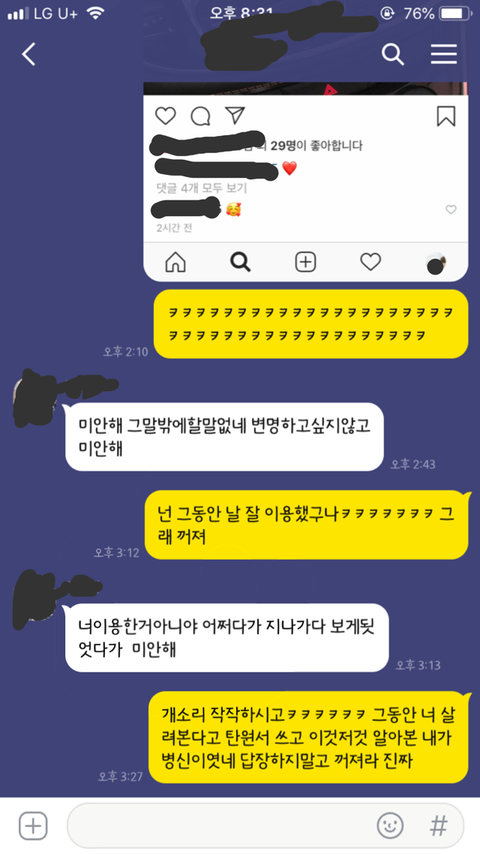 캡쳐떠서 바로 너한테 보냈더니 바로 할말없다고 변명 안한다고 미안하다 그러네