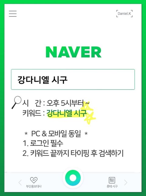 5시부터 초록창에 (( 강다니엘 시구 ))를 검색해주세오