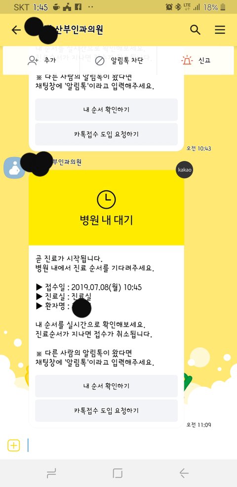 접수하고 나니까 카톡에 산부인과가 뜨더니 거기서 대기 순번을 알려주네요
