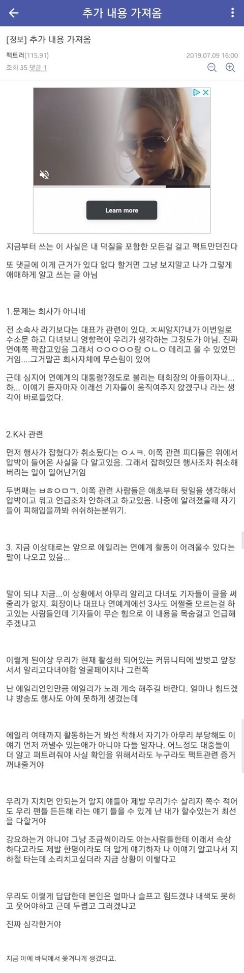 마지막으로 에일리 전 소속사 대표였던 조유명이 현재 에일리의 앞길을 모두 막고 있음 음악방송외에 예능 심지어 앞으로의 가수활동 인생도. 무엇보다 소속사를 아끼고 좋아했던 에일리에게 이번 사건은 너무 배신감 느끼고 충격이였을거라고 생각됨.. 그런데 이상하게도 소속가수 중 에일리에게만 이러고 있어. 이유는 아무도 모르지만 추가폭로한 사람 말로는 에일리 잘못은 없을거라고 했어. 보컬 퍼포먼스 어느 하나 부족하지 않고 항상 밝았던 에일리가 그동안 어디에 말도 못하고 꾹꾹 숨기고 있었을 생각만 하면 너무 안타까운데.. 우리나라에 이런 여자 솔로 가수가 어디있냐고.. 모두 그냥 지나치지말고 관심 가져주고 에일리 이번 신곡 음악도 한번씩 들어줬으면 좋겠어 응원의 댓글도 시간 되면 달아주고.. 댓글 다 본다 하더라ㅠㅠ