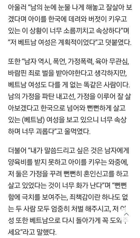 불륜사실 제외하고라도 본인포함 친정엄마까지 한국체류하게 해달라는건 너무한거 아닌가? 폭행은 남편이 했는데 왜 한국정부가 보상해줘야 하지?