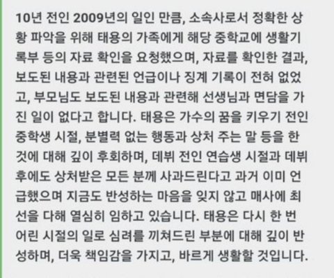 2016년 NCT 라이프에서 울면서 사과하는 영상을 보면 어린시절 말과 행동을 철없이 한것에 대한 함축적인 사과를 하고 있으며 이후 악성 안티들에 의한 학폭논란이 일었을때 소속사 공식입장이 재차 나왔었는데 댓글사건에 대해 수년전에 이미 사과한 내용이라고 분명히 명시를 하게 됨