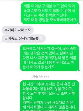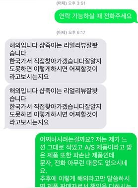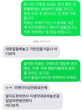 다시 보낸 제품마저 불량이기에 리뷰를 작성한건데 이렇게 협박하는 판매자에 대해서