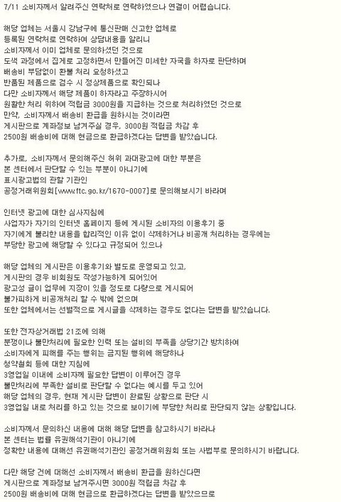 서울시전자상거래센터에서도 사진을 못봐서 정상제품인데 제가 우겨서 환불해 줬고 2500원보다 많은 3000원을 마일리지로 적립하는 등 최선을 다하고있다 라고만 이야기합니다.