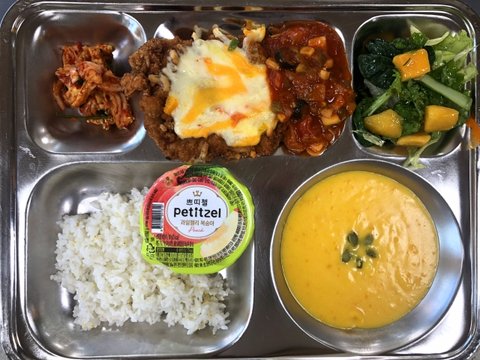 피자돈까스 망고샐러드 단호박죽!!우리 학교 망고샐러드 최고입니다 진짜