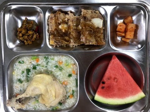 오늘 초복이라고 삼계죽 나왔어요 ㅠㅠ애들이 싱겁다니까 영양사님께서 직접 돌아다니시면서 소금 뿌려주셨어용 ㅎㅎ